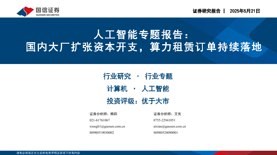 【国信证券】【20250521】人工智能行业专题报告:国内大厂扩张资本开支,算力租赁订单持续落地-25页