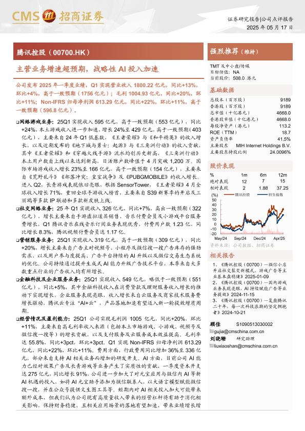 【海通证券】【20250517】腾讯控股(00700.HK)主营业务增速超预期,战略性AI投入加速-14页