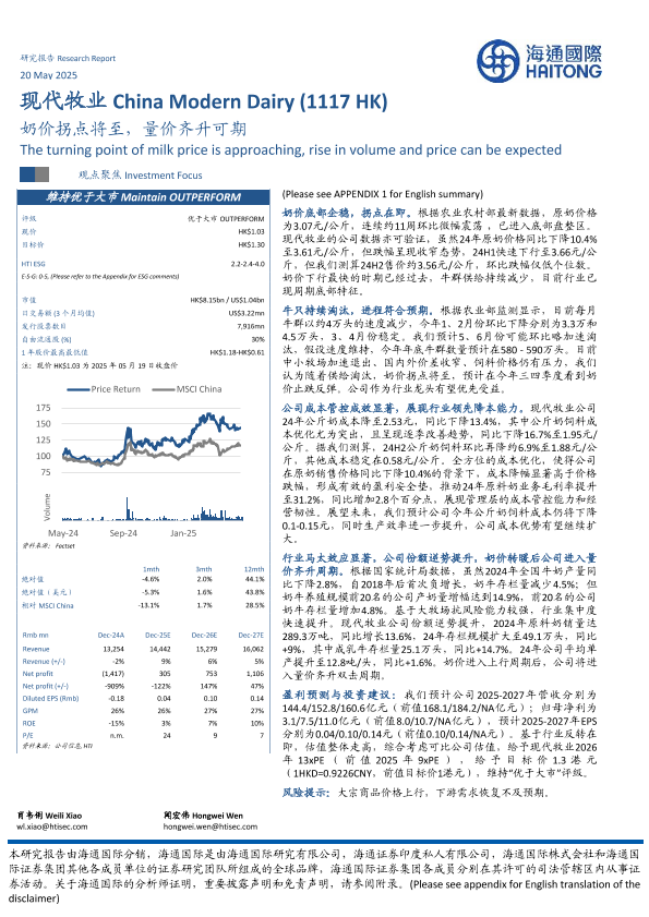 【海通国际】【20250520】现代牧业奶价拐点将至,量价齐升可期-13页