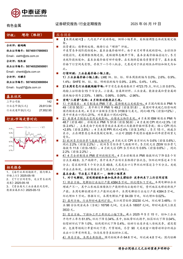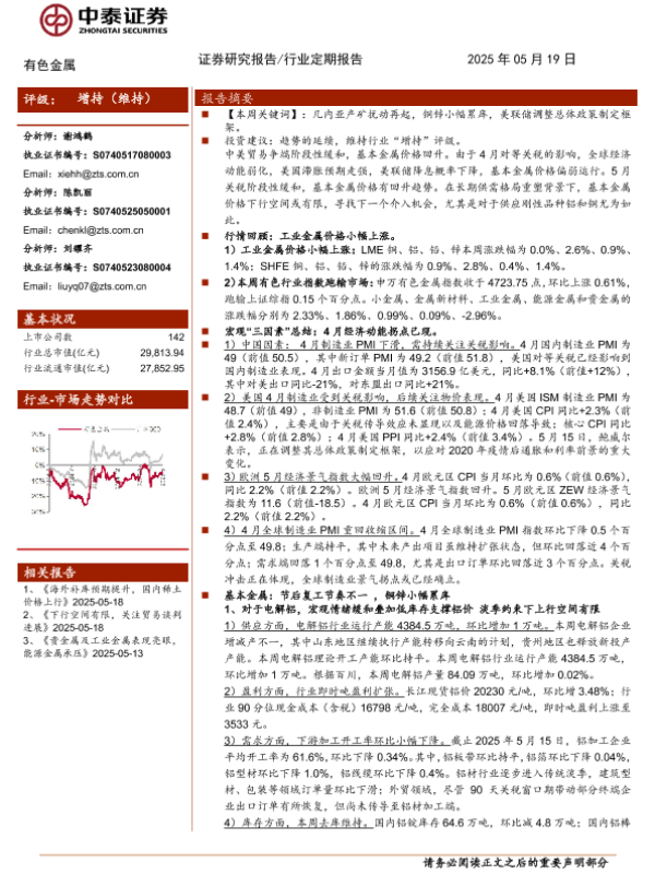 【中泰证券】【20250519】有色金属行业:铜锌小幅累库,关注下游需求节奏-25页