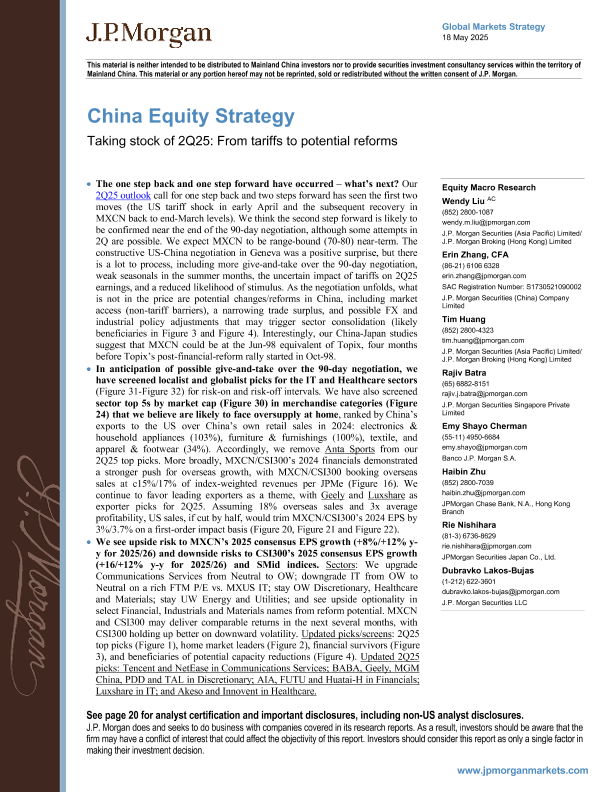 【J.P. Morgan】【20250518】China Equity Strategy Taking stock of 2Q25 From tariffs to potential reforms-25页