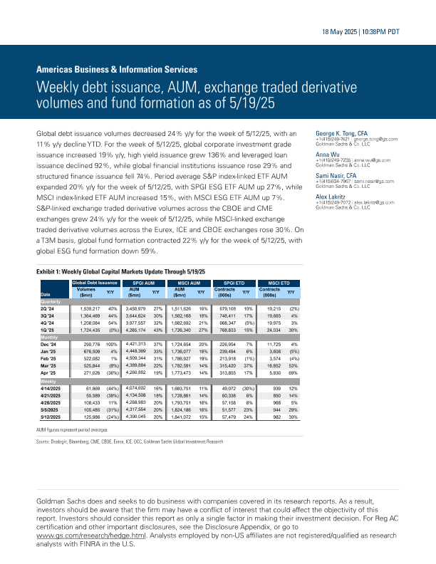 【Goldman Sachs】【20250518】截至2025年5月19日的美洲商业与信息服务部门每周债务发行、资产管理规模、交易所交易衍生品交易量和基金设立情况-17页