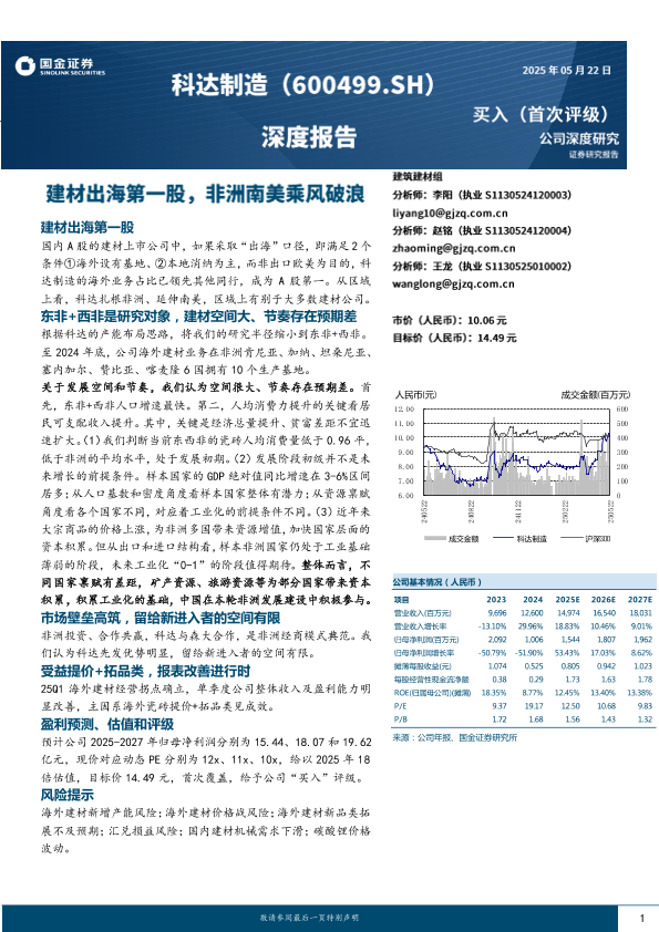 建材出海 海外业务扩展 盈利预测 科达制造 非洲市场