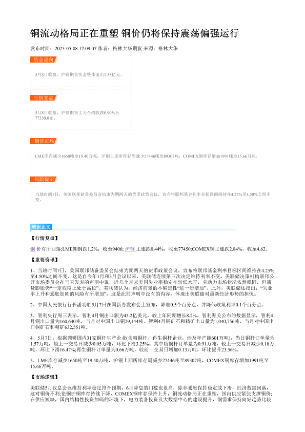 【格林大华期货】【20250508】铜流动格局正在重塑 铜价仍将保持震荡偏强运行-2页