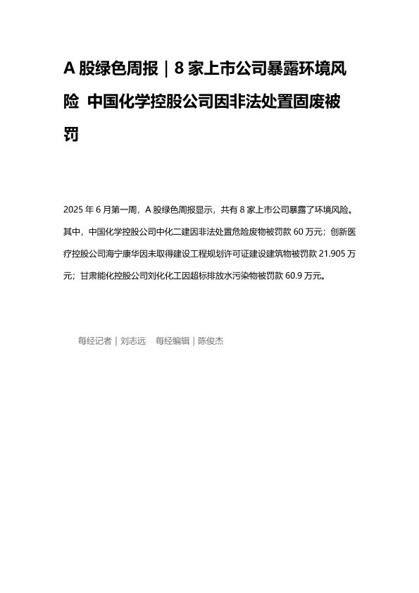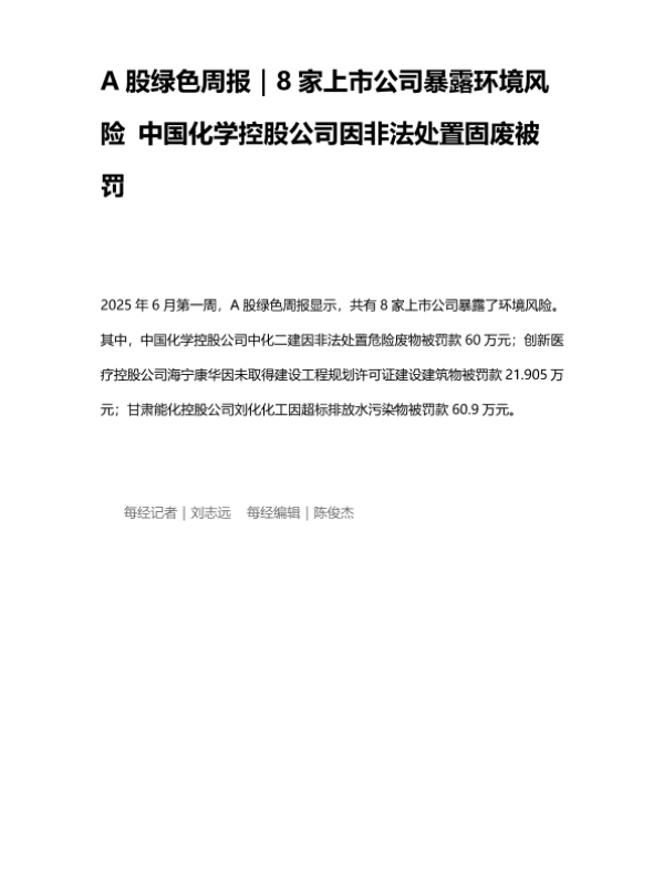 【IPE】【202506】A股绿色周报|8家上市公司暴露环境风险 中国化学控股公司因非法处置固废被罚-8页