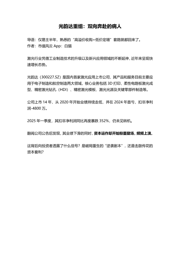低价定增 光韵达 资本运作 重组 高溢价收购