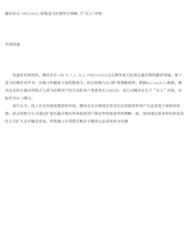 【Goldman Sachs】腾讯音乐-SW(01698) 收购喜马拉雅符合策略,予"买入"评级-1页