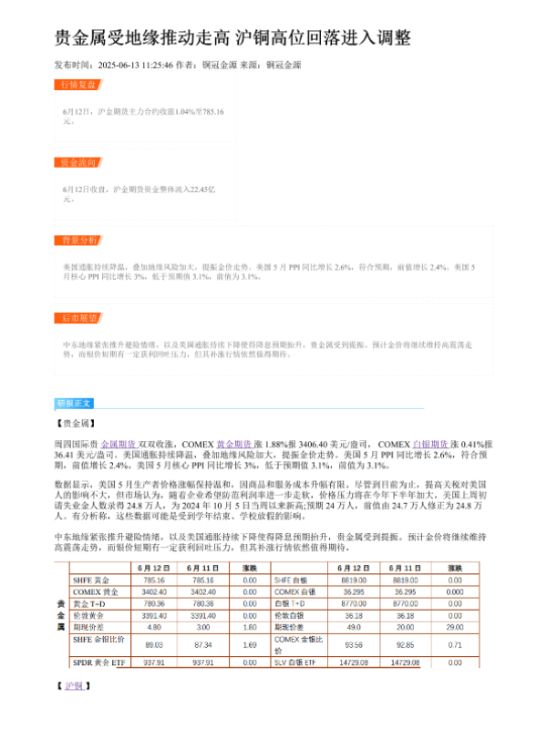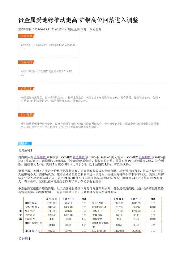【铜冠金源期货】【20250613】贵金属受地缘推动走高 沪铜高位回落进入调整-2页