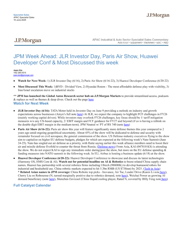 【J.P. Morgan】【20250615】摩根大通展望下周:捷豹路虎投资者日、巴黎航展、华为开发者大会及本周热门讨论-6页