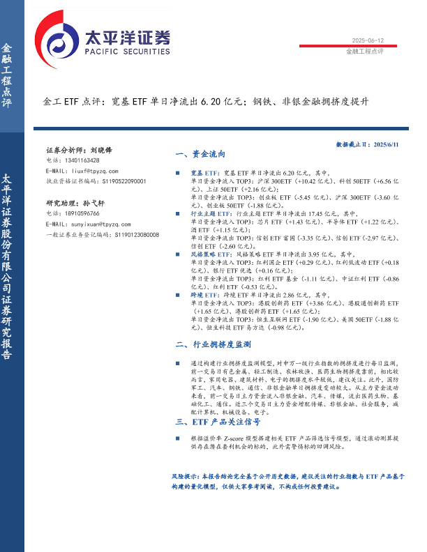 【太平洋证券】【20250611】金工ETF点评_宽基ETF单日净流出6.20亿元;钢铁_非银金融拥挤度提升-6页