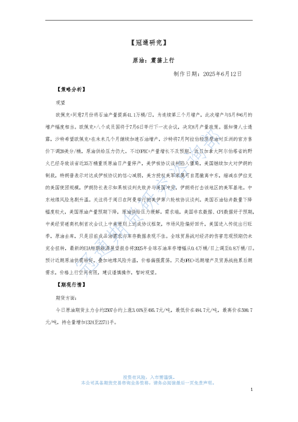 OPEC+ 原油供需 地缘政治风险 震荡上行 原油期货
