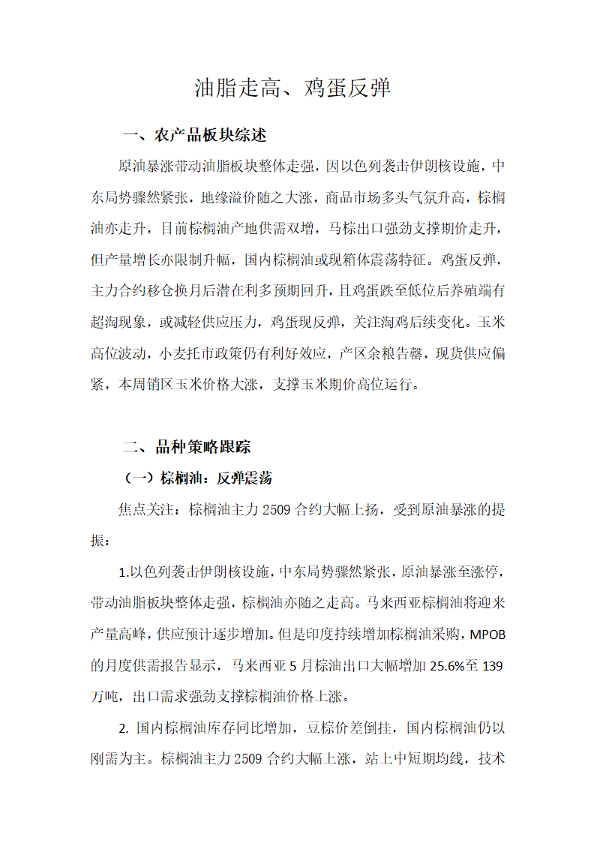 中东局势 农产品期货 市场价格波动 油脂市场 鸡蛋期货