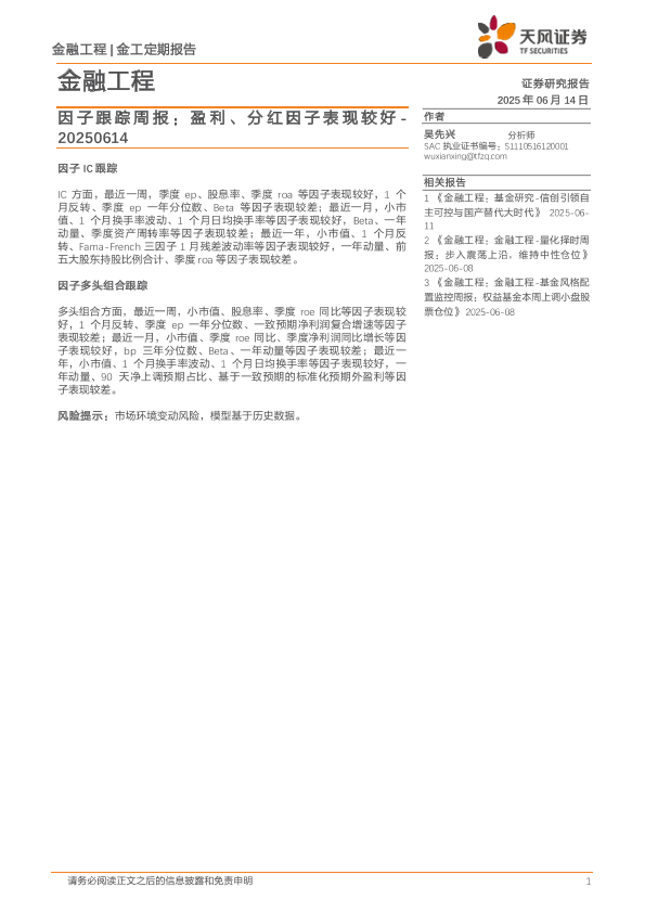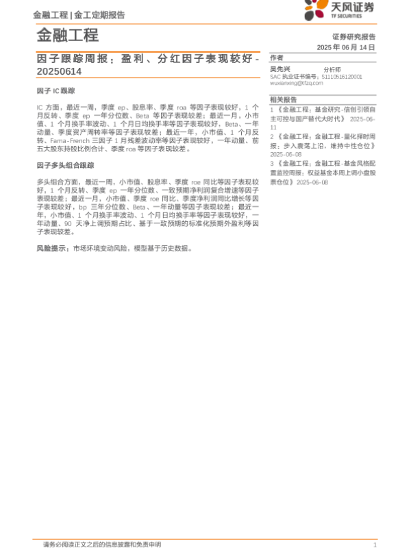 【天风证券】【20250614】因子跟踪周报:盈利、分红因子表现较好-7页