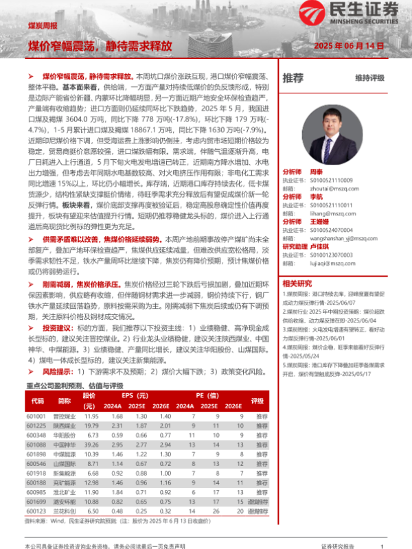 【民生证券】【20250614】煤炭周报 煤价窄幅震荡,静待需求释放-22页