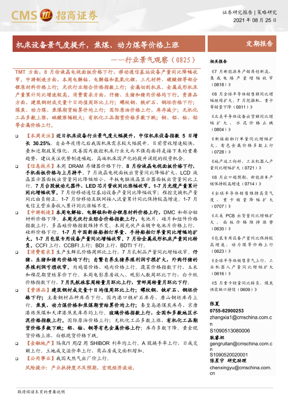 【海通证券】【20210825】行业景气观察:机床设备景气度提升,焦煤、动力煤等价格上涨-36页
