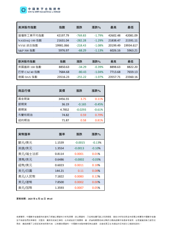 【南方汇发国际】【20250616】美洲及欧洲股市指数、商品行情与货币汇率报告-1页