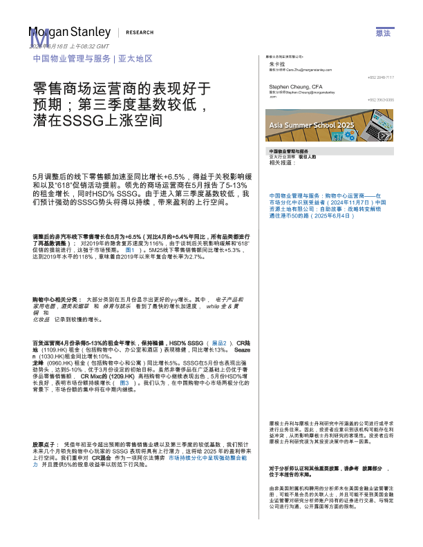 【Morgan Stanley】【20250616】5月商场运营商表现好于预期;第三季度在低基数上同店销售额(SSSG)有潜在上行空间-10页