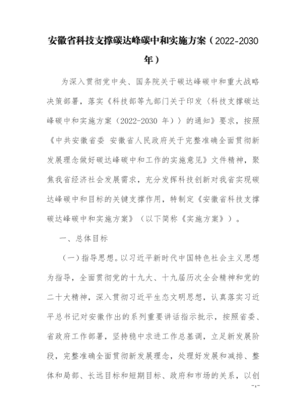 安徽省 实施方案 碳中和 碳达峰 科技创新