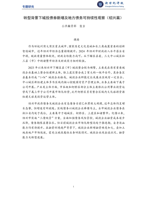【新世纪评级】【2024】转型背景下城投债券新增及地方债务可持续性观察(绍兴篇)-19页