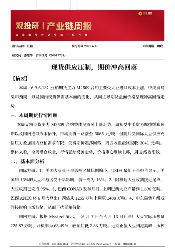 【国金期货】【20250616】豆粕周报_现货供应压制_期价冲高回落-3页