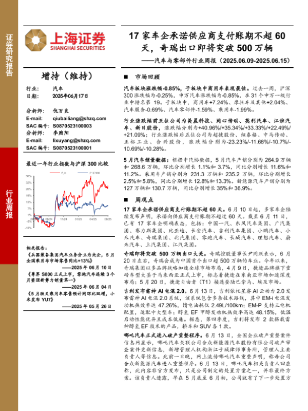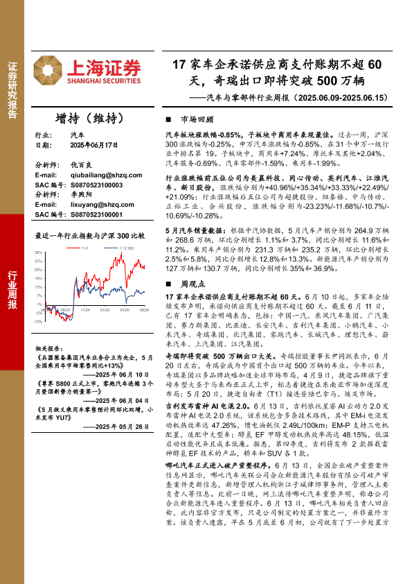 【上海证券】【20250617】汽车与零部件行业周报_17家车企承诺供应商支付账期不超60天_奇瑞出口即将突破500万辆-3页