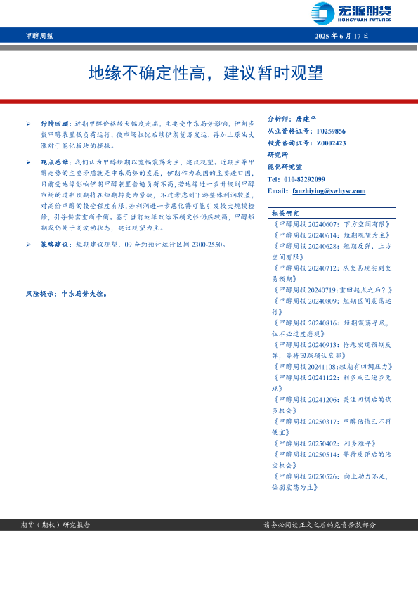 【宏源期货】【20250617】甲醇周报:地缘不确定性高,建议暂时观望-11页