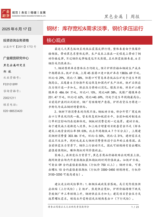 【广金期货】【20250617】黑色金属周报_钢材_库存宽松_需求淡季_钢价承压运行-23页