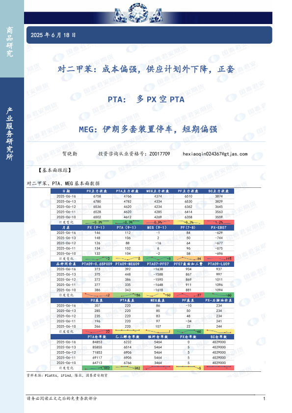 【国泰君安期货】【20250618】对二甲苯_成本偏强_供应计划外下降_正套_PTA_多PX空PTA_MEG_伊朗多套装置停车_短期偏强-4页