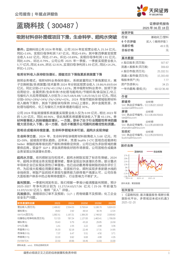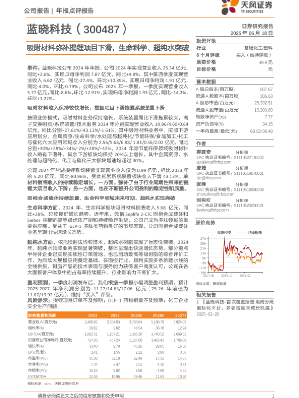 【天风证券】【20250618】蓝晓科技-300487.SZ-吸附材料弥补提锂项目下滑_生命科学_超纯水突破-3页
