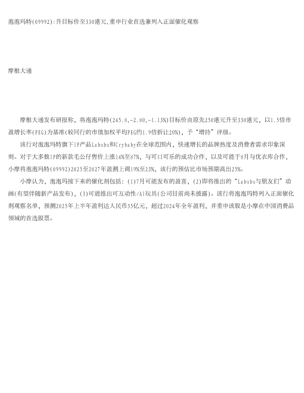 IP产品 正面催化剂 泡泡玛特 消费品牌 目标价上调