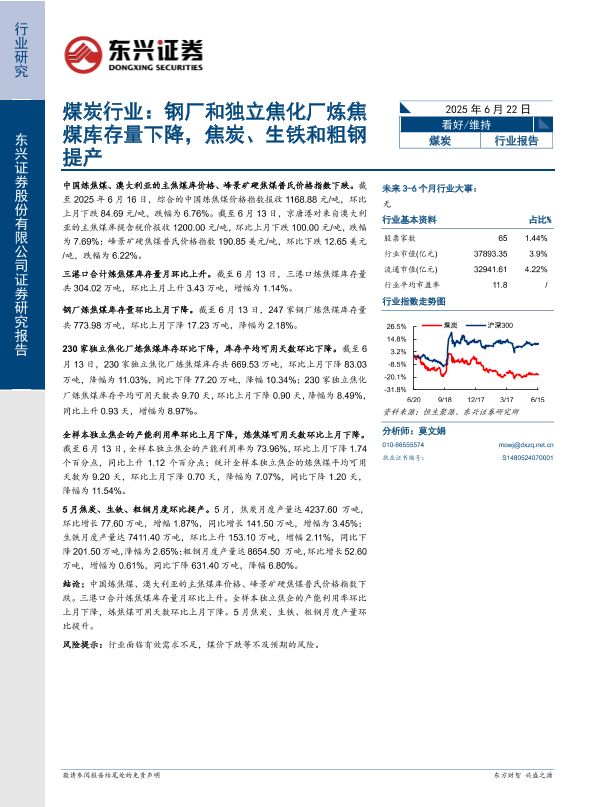 【东兴证券】【20250622】煤炭行业:钢厂和独立焦化厂炼焦煤库存量下降,焦炭、生铁和粗钢提产-8页