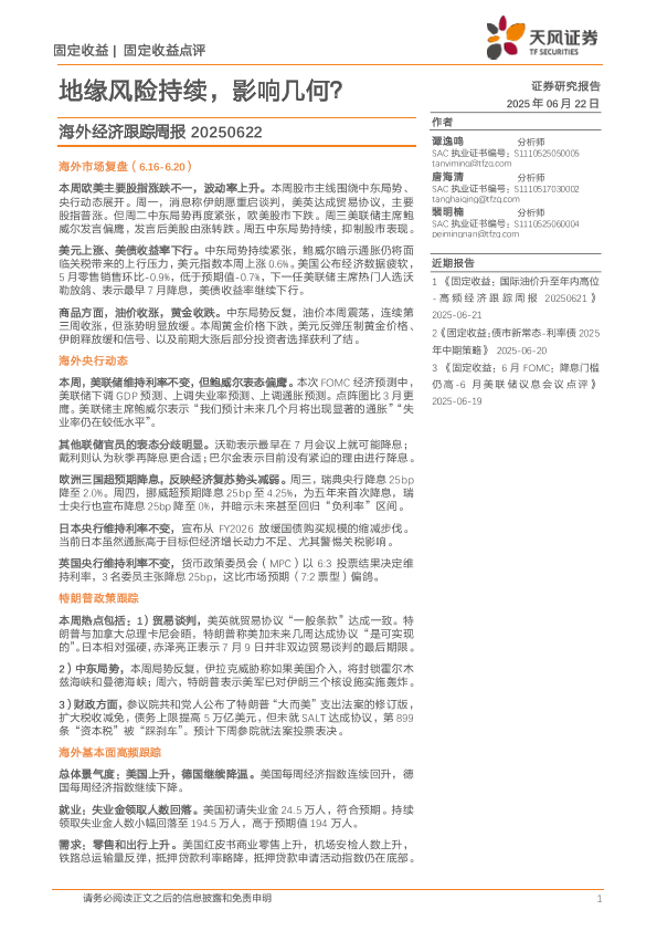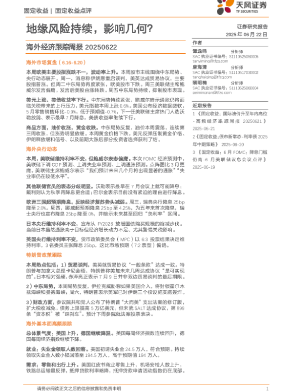【天风证券】【20250622】海外经济跟踪周报:地缘风险持续,影响几何?-19页