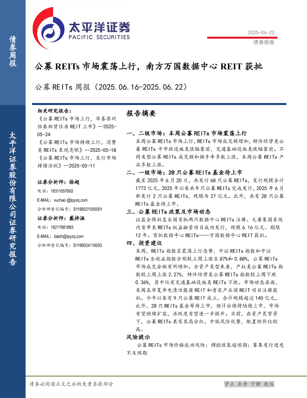 【太平洋证券】【20250622】公募REITs周报_公募REITs市场震荡上行_南方万国数据中心REIT获批-16页