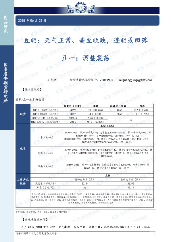 【国泰君安期货】【20250623】豆粕_天气正常_美豆收跌_连粕或回落_豆一_调整震荡-3页
