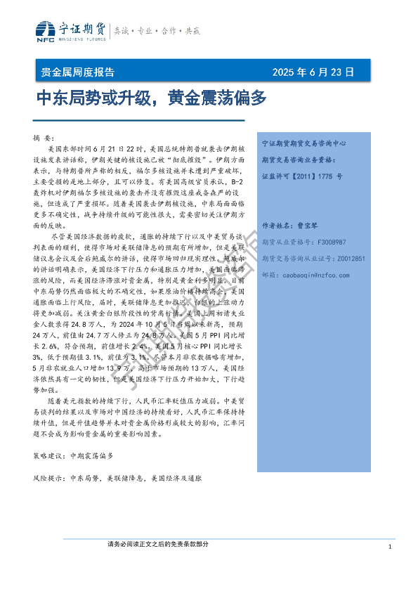 【宁证期货】【20250623】贵金属周度报告_中东局势或升级_黄金震荡偏多-9页