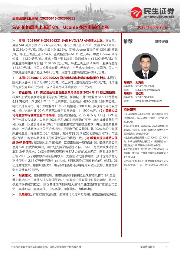 【民生证券】【20250623】生物柴油行业周报_SAF价格周内上涨近8_Ucome多地离岸价上涨-7页