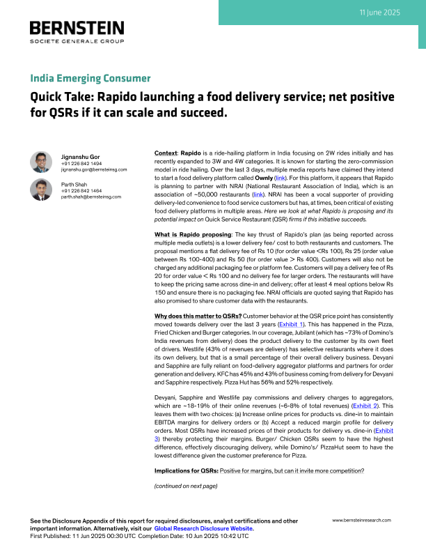 【Bernstein】【20250611】印度新兴消费者:快速洞察:Rapido推出食品配送服务;若能扩大规模并取得成功,对快餐连锁店(QSR)总体有利-13页