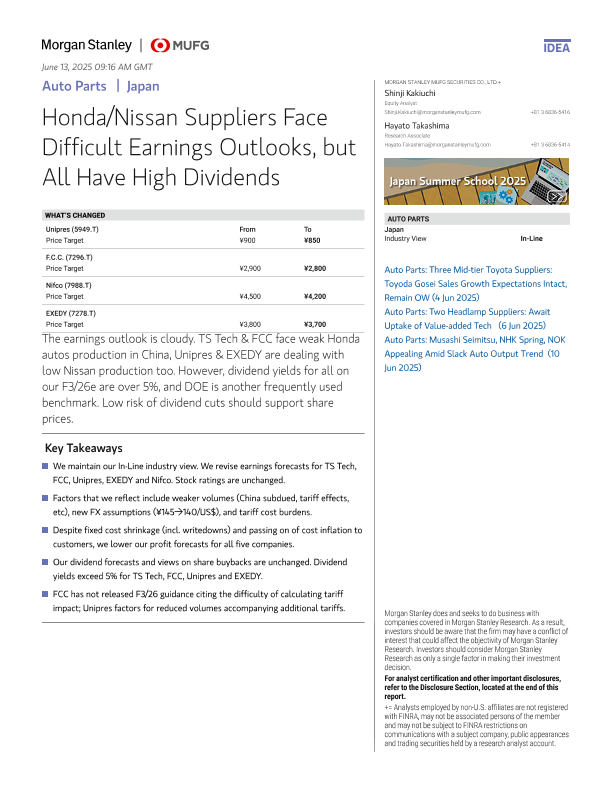【Morgan Stanley】【2025】Honda/Nissan Suppliers Face Difficult Earnings Outlooks, but All Have High Dividends-30页