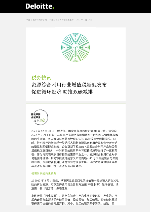 【德勤】【20220117】税务快讯:资源综合利用行业增值税新规发布,促进循环经济 助推双碳减排-5页