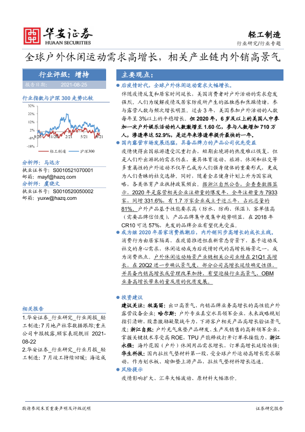 【华安证券】【20210825】轻工制造行业专题:全球户外休闲运动需求高增长,相关产业链内外销高景气-20页