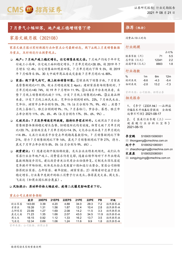 【海通证券】【20210821】轻工时尚行业:家居文娱月报,7月景气小幅回落,地产竣工稳增销售下滑-16页
