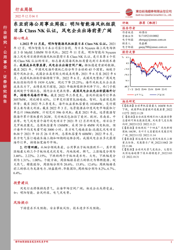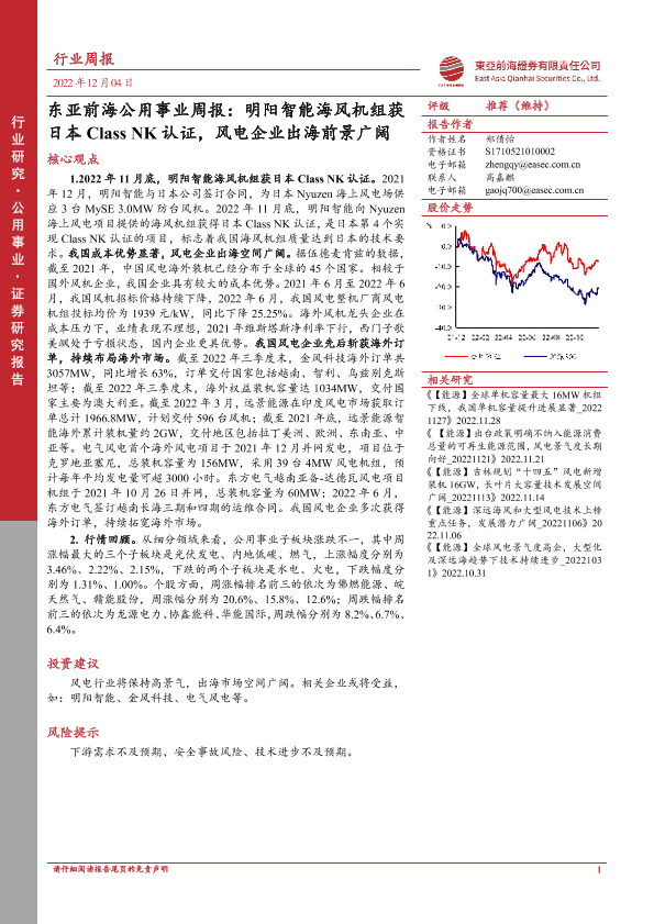 【东亚前海证券】【20221204】东亚前海公用事业周报:明阳智能海风机组获日本Class NK认证,风电企业出海前景广阔-14页