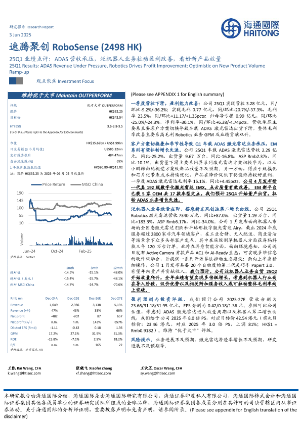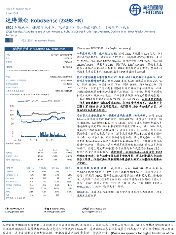 【海通国际】【20250603】速腾聚创25Q1业绩点评:ADAS营收承压,泛机器人业务拉动盈利改善,看好新产品放量-12页