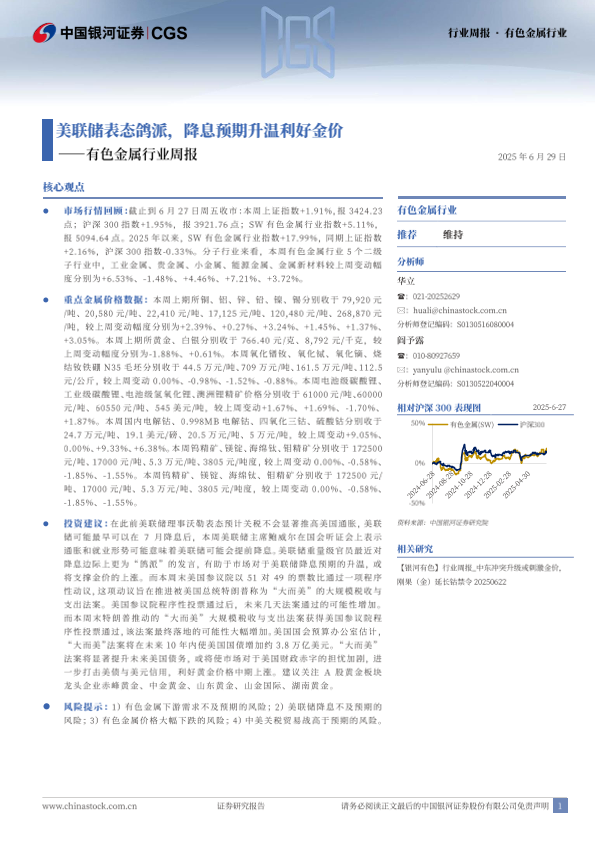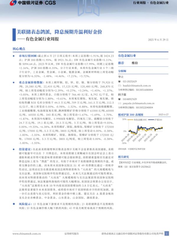 【银河证券】【20250629】有色金属行业周报:美联储表态鸽派,降息预期升温利好金价-20页