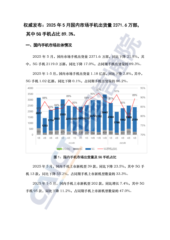 【中国信息通信研究院】【202505】手机权威发布:2025年5月国内市场手机出货量2371.6万部,其中5G手机占比89.3%-3页