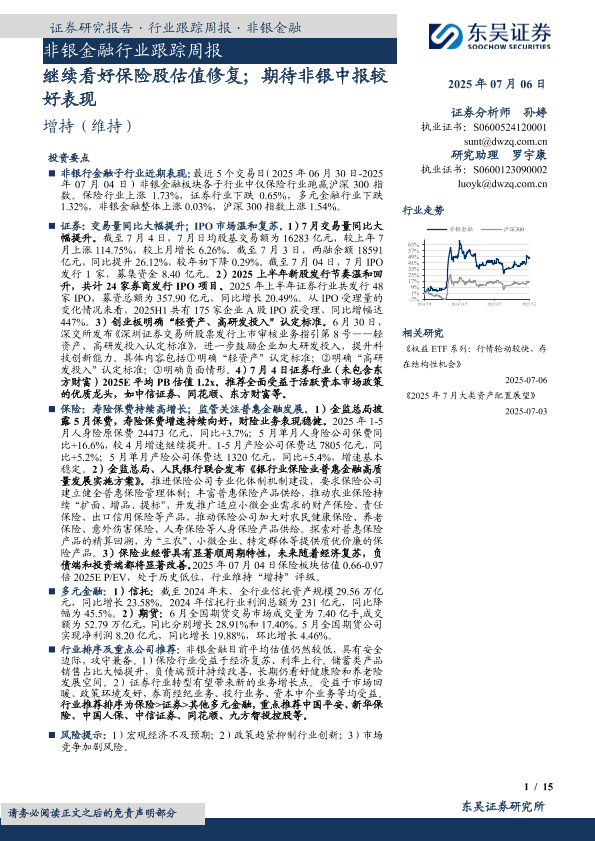 【东吴证券】【20250706】非银金融行业跟踪周报_继续看好保险股估值修复;期待非银中报较好表现-15页