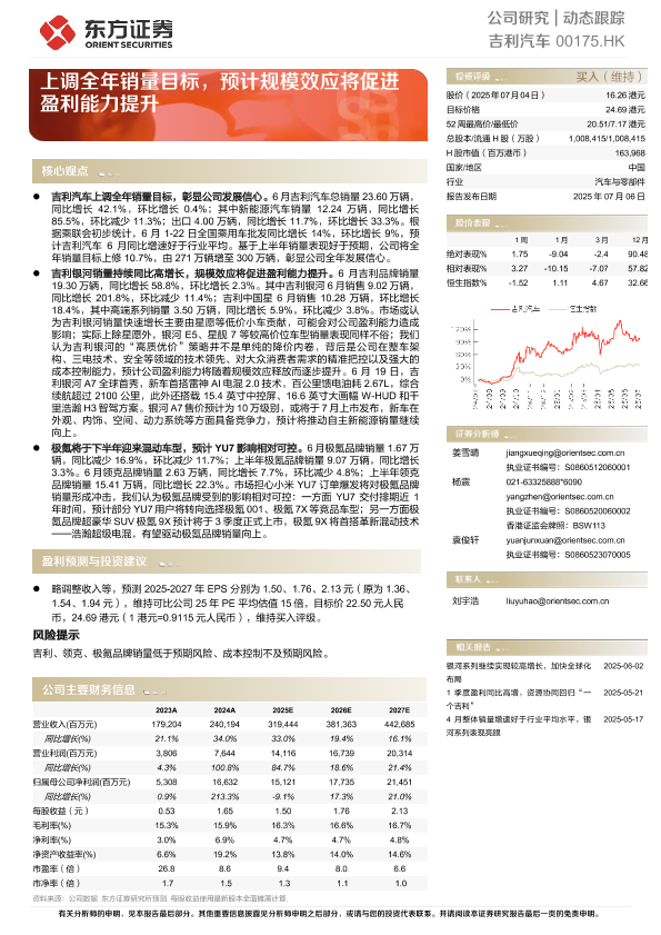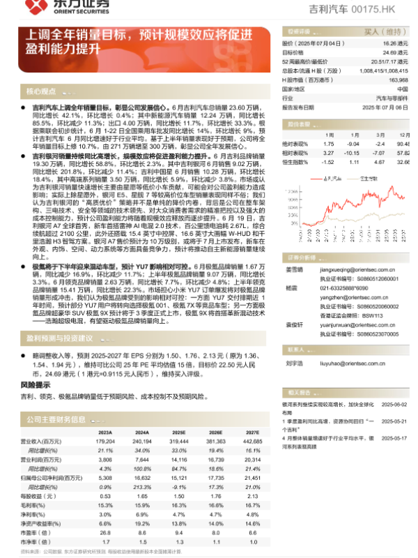 【东方证券】【20250706】吉利汽车上调全年销量目标_预计规模效应将促进盈利能力提升-4页