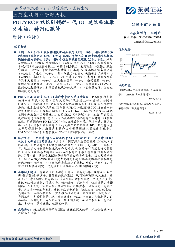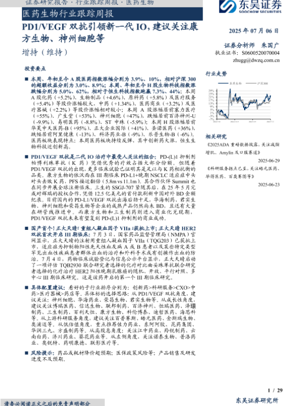 【东吴证券】【20250706】医药生物行业跟踪周报:PD1/VEGF双抗引领新一代IO,建议关注康方生物、神州细胞等-29页