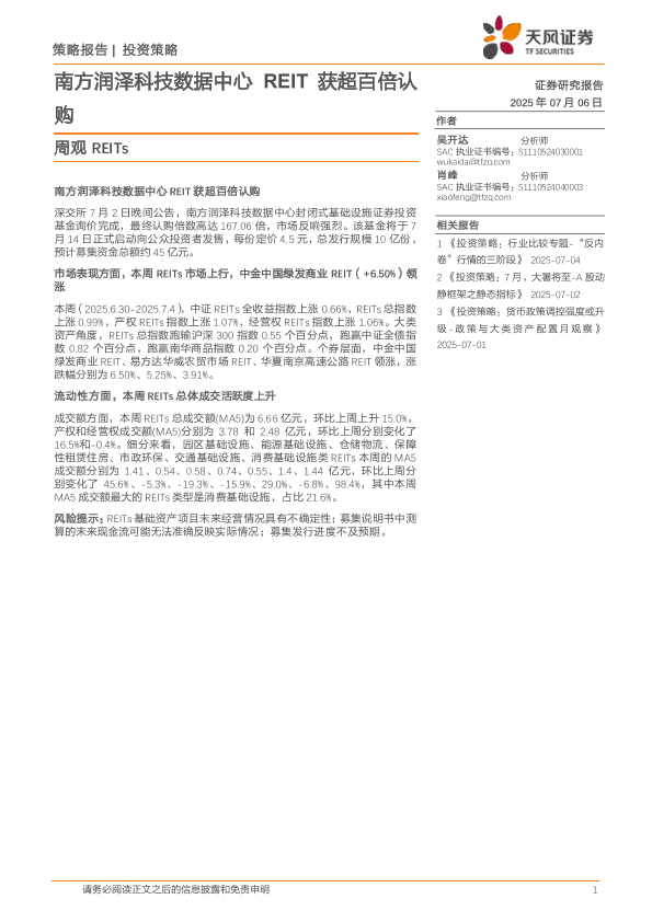 【天风证券】【20250706】周观REITs:南方润泽科技数据中心REIT获超百倍认购-13页