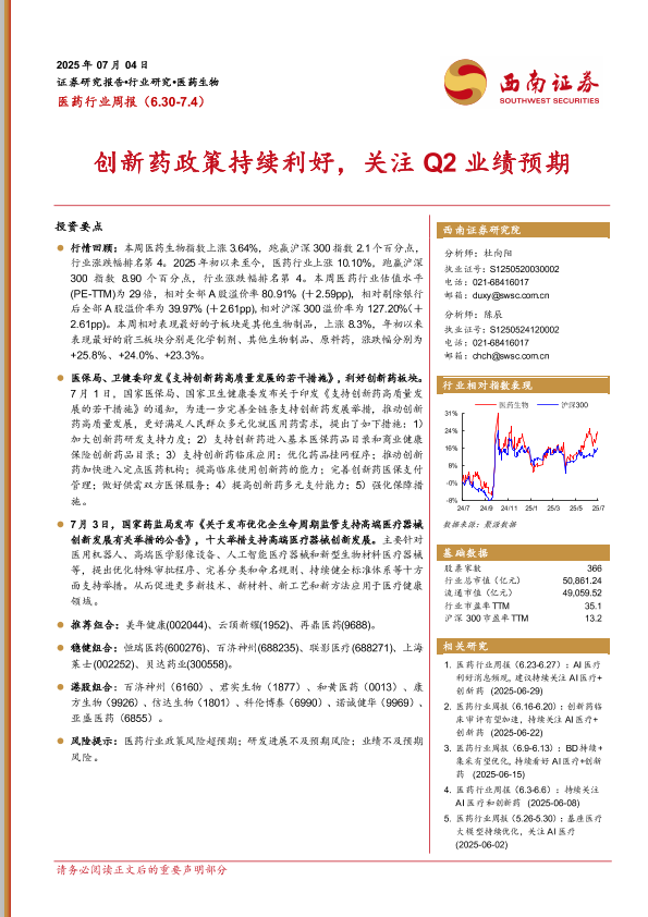 【西南证券】【20250704】医药行业周报:创新药政策持续利好,关注Q2业绩预期-30页